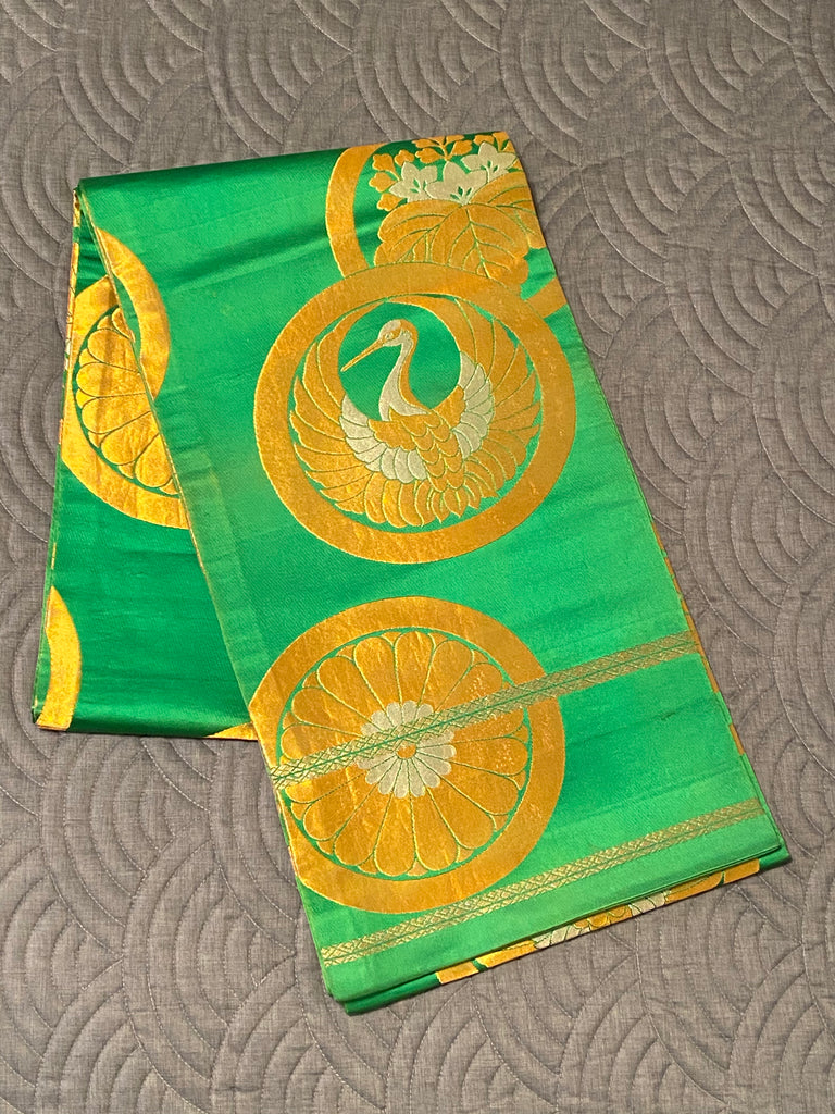 Vintage Japanese green silk obi with Crane and 2 other designs